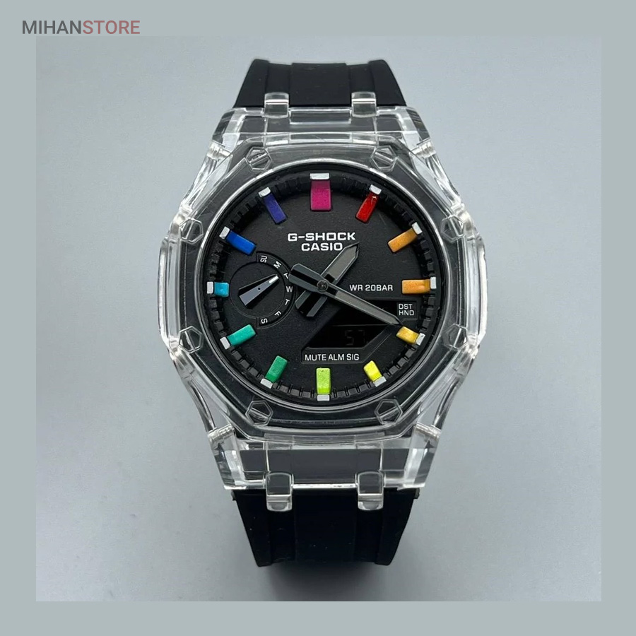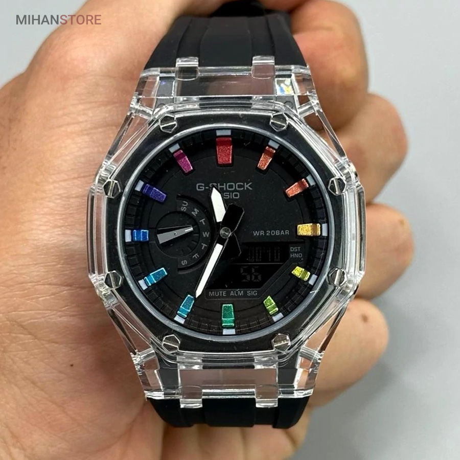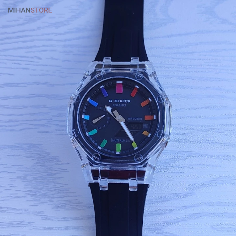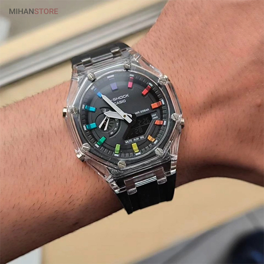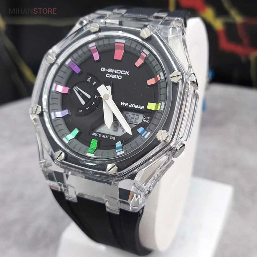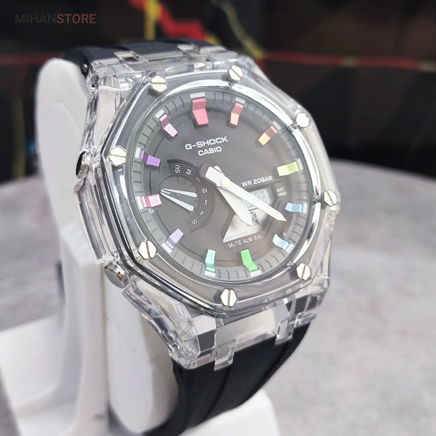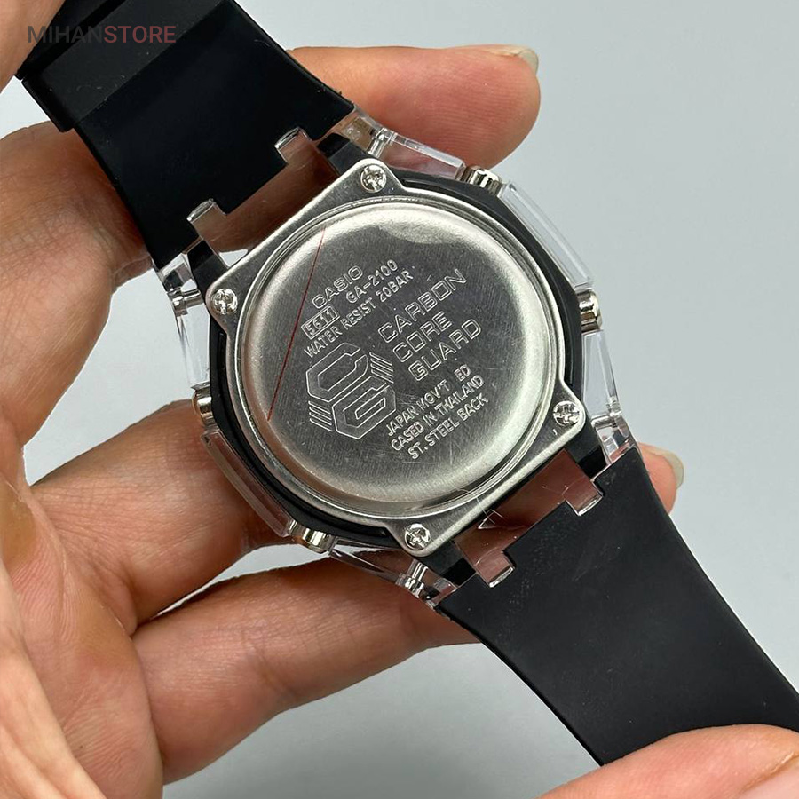 ساعت مچی ضدآب کاسیو جی شاک - GA2100، یک ساعت مدرن و مقاوم است که برای افراد فعال و علاقه‌مند به سبک‌های ماجراجویانه طراحی شده است. این ساعت مچی جی شاک دارای بند رابر مشکی و صفحه مشکی است که به آن ظاهری اسپرت و شیک می‌بخشد. جنس رابر بند، علاوه بر سبک بودن، بسیار مقاوم و ضد ضربه است که آن را برای استفاده روزمره و شرایط سخت مناسب می‌کند. این ساعت دو موتوره می باشد و به صورت های کپی (با کیفیت فوق العاده بالا) تولید شده است و همراه با جعبه ای شکیل عرضه می شود.